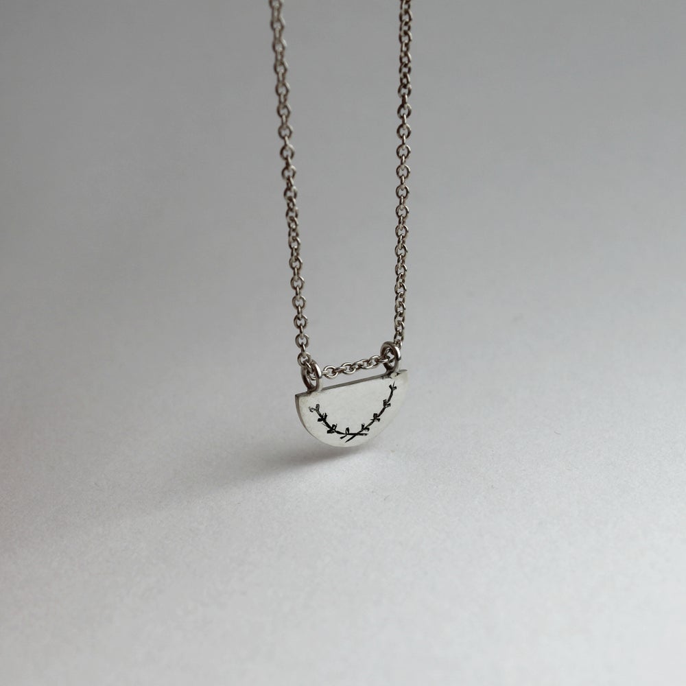 A sterling silver half round pendant with a hand engraved botanical laurel leaf design.